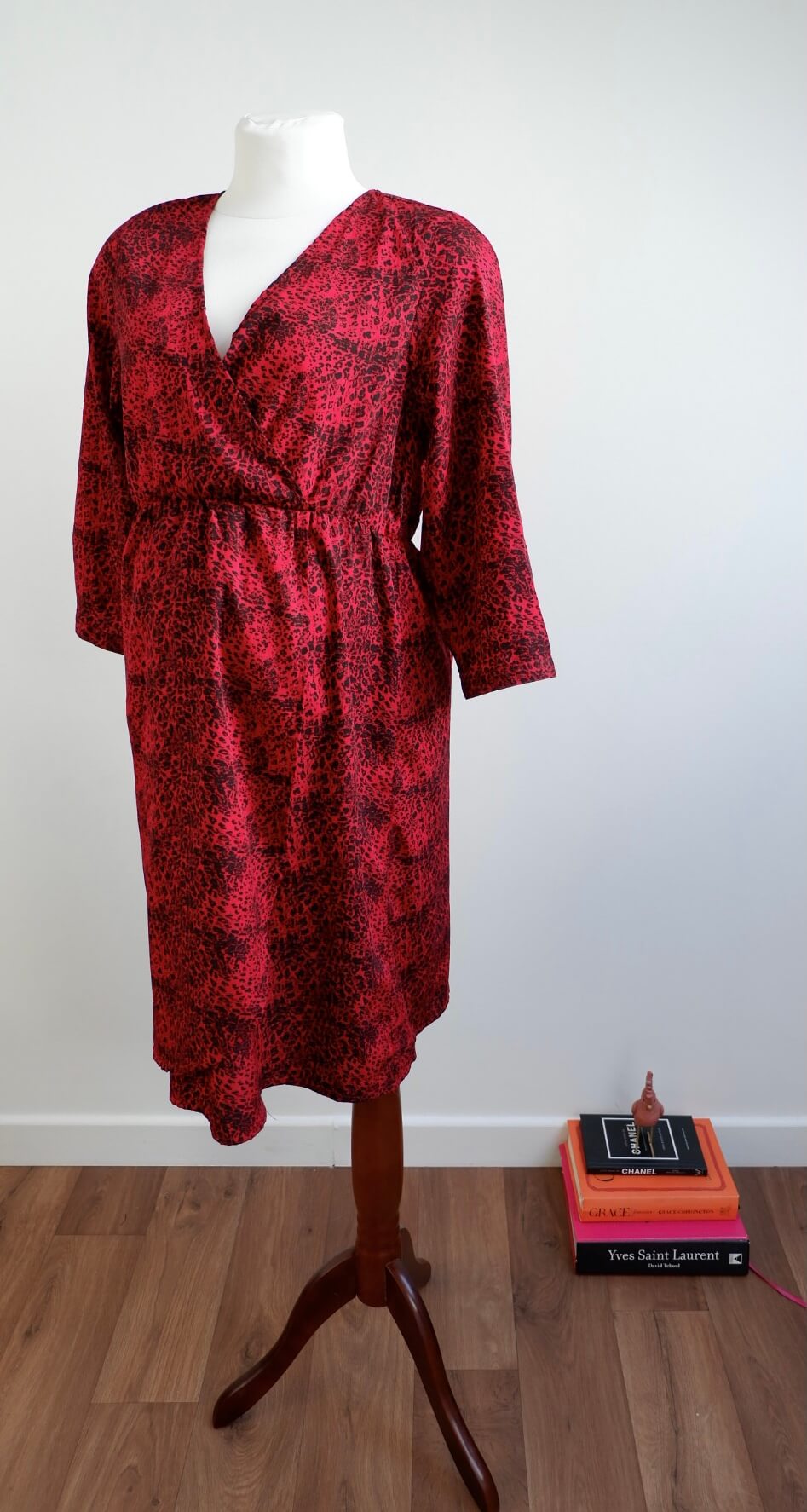 Mamalicious maternity dress in a bold red, snake-inspired print. Featuring a faux wrap V-neck and matching faux wrap skirt. Finished with a small button at each cuff, this dress will provide many style options. Think occasion dress with black heels to weekend dress with tights and boots.