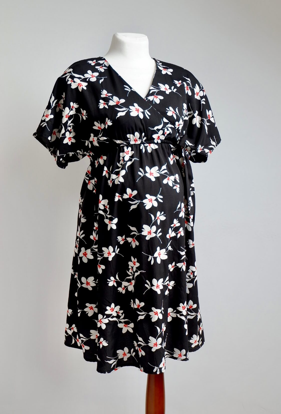 Beautiful faux wrap floral print maternity dress feature drop shoulder short sleeves, an elastic waist and faux wrap skirt.