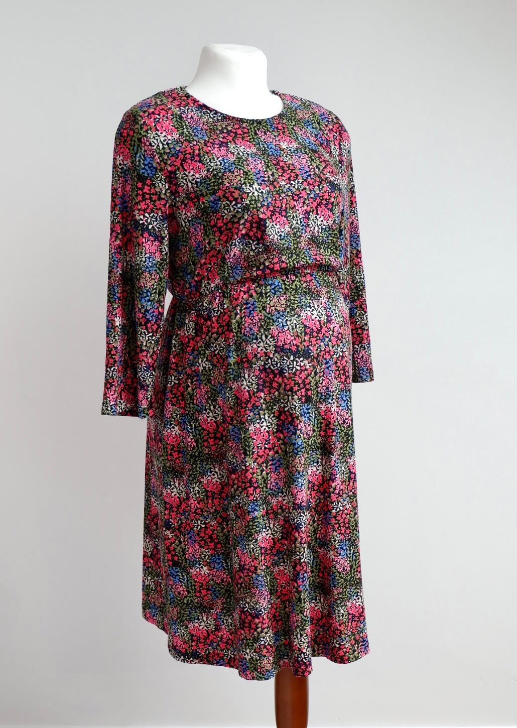 Next Floral maternity dress with a round neck line, long sleeves and an elastic waist. This beautiful floral print and soft viscose fabric make this dress an easy and comfortable addition to your wardrobe.