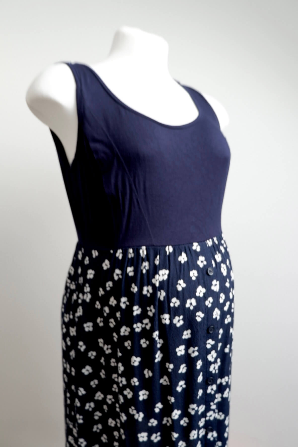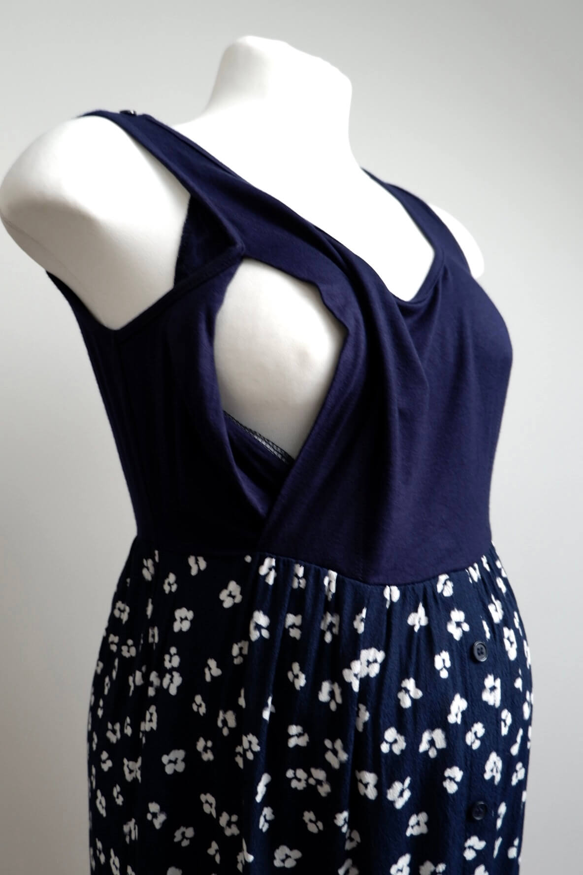 Seraphine Navy Floral Jumper Style Maternity and Nursing Dress features a soft floral print skirt which drapes over your bump, a detachable ribbed knit top with a lift up style for nursing access. A great 2 piece that can be versatile and worn both during pregnancy and postpartum.