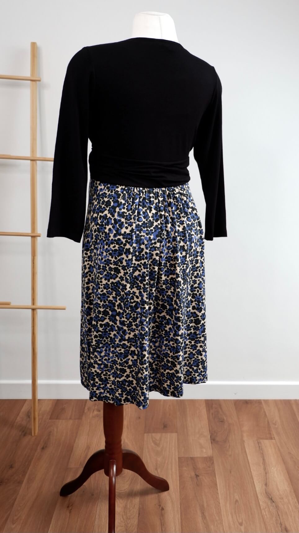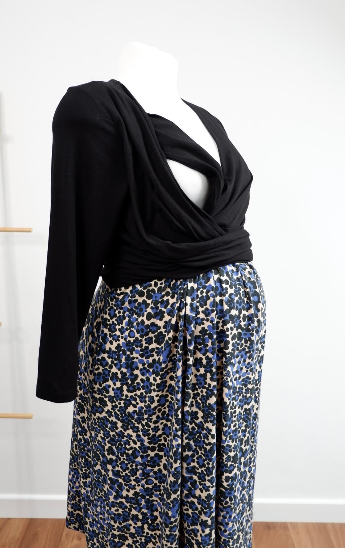 Seraphine maternity and breastfeeding dress features a stretch faux wrap black top with inner layer for breastfeeding access and a stylish animal print skirt. This beautiful dress will give you comfort both during your pregnancy and postpartum.