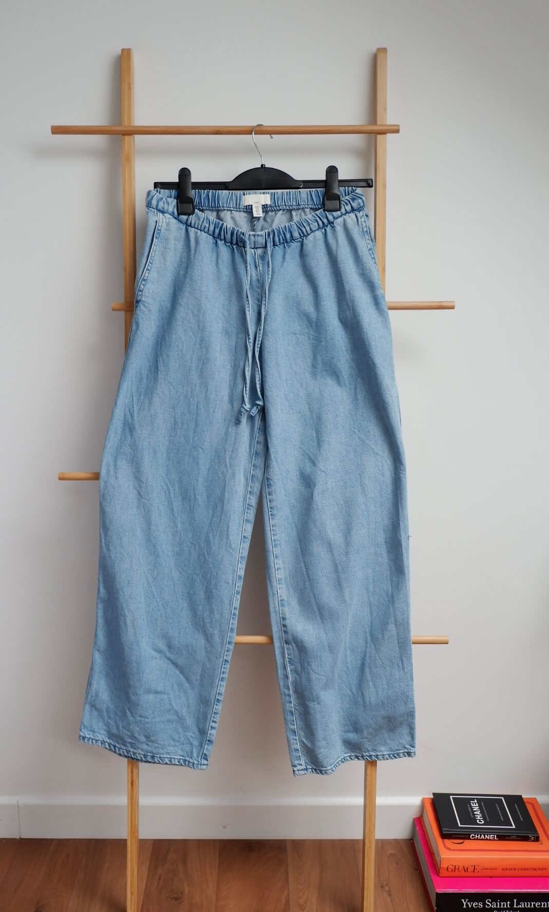 H&M Mama denim style trousers come in lightweight denim feature a low waist with elasticated drawstring waist, two side pockets and a loose-fitting leg. A great addition to your wardrobe for both pregnancy and postpartum.